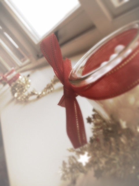 Pak nu je glazen pot en je kerstlint. Zorg er eerst voor dat je glazen pot helemaal schoon is (ik moest de mijne namelijk eerst schoonmaken, omdat er eerst een kaars in heeft gezeten). Met je kerstlint maak je een strik om de pot heen.