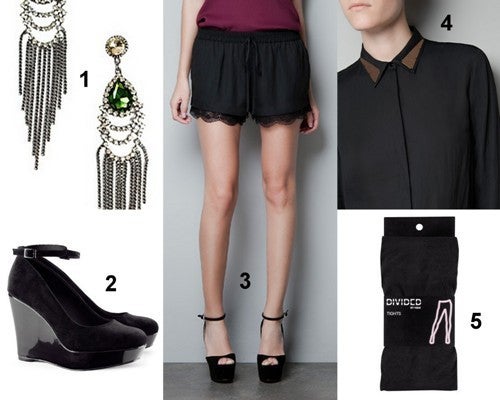 1. Oorbellen, Nelly €19.95, 2. Schoenen, H&M €34.95, 3. Kanten Short, Zara €29.95, 4. Blouse, Zara €39.95, 5. Panty 40 den, H&M €6.95